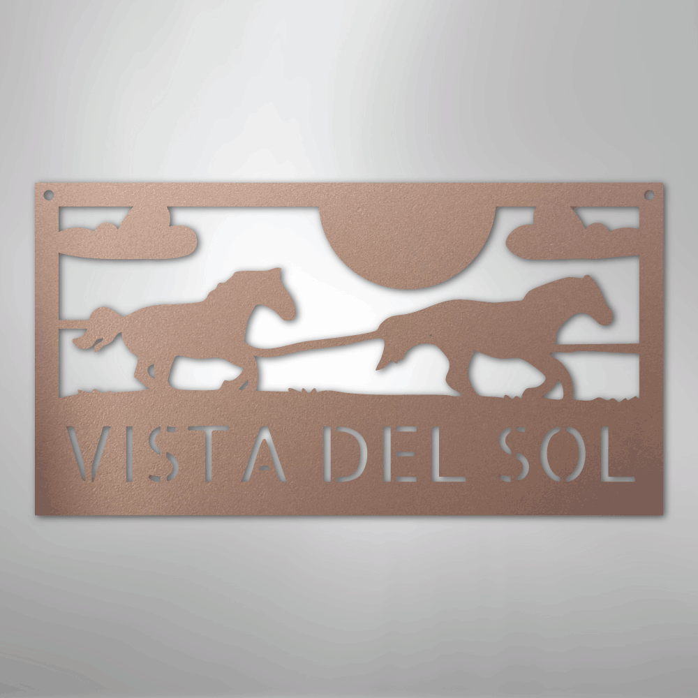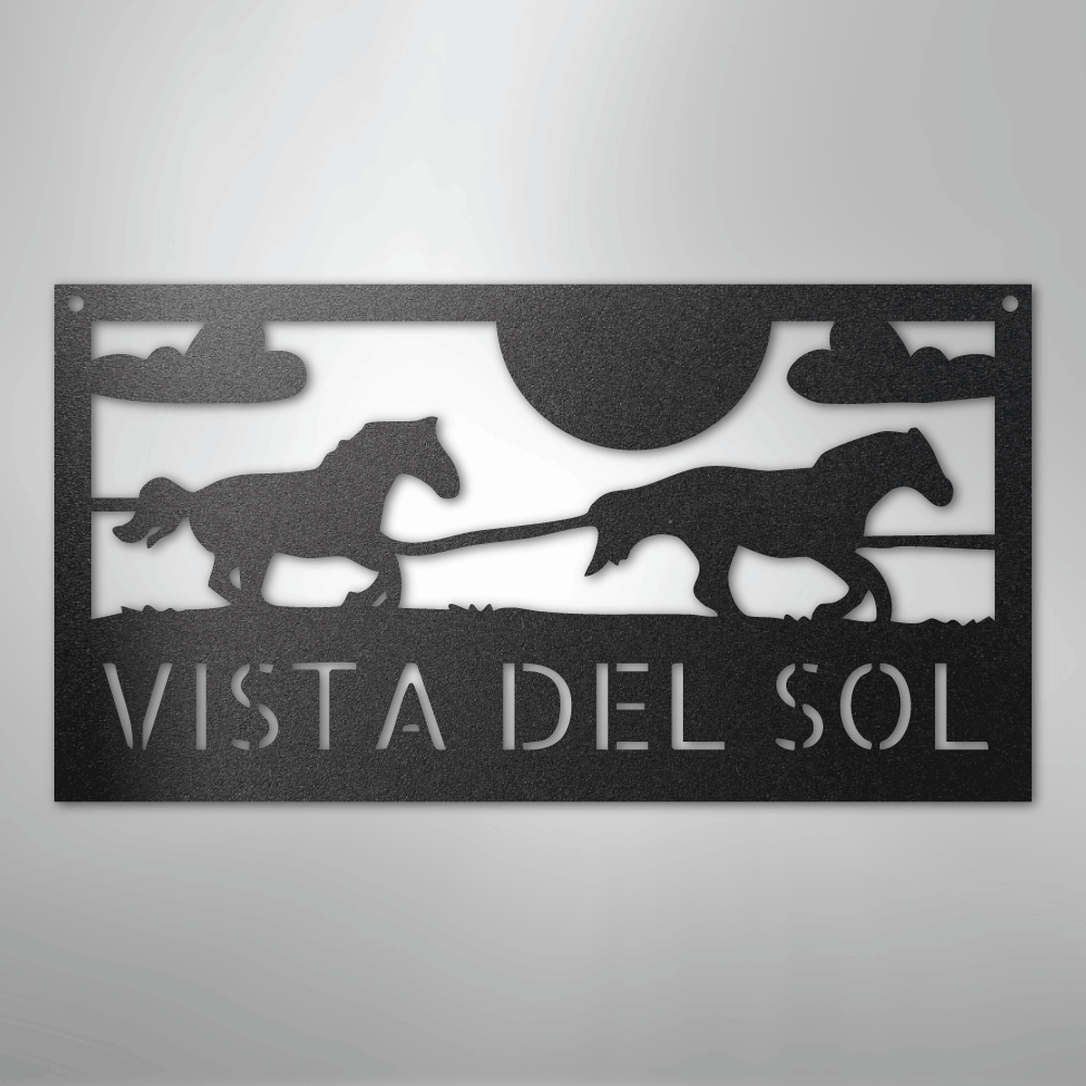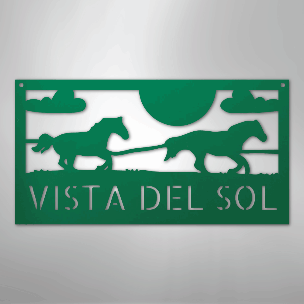 Detailed cuts are highlighted in this gorgeous sign that will display amazingly in your family room, barn, stable -- anywhere a horse-y reminder fits the bill! This lovely custom laser-cut sign features a pair of running horses with windswept manes and tales -- plus clouds and sun! Nice area for your personalization at the bottom of this rectangular plaque!