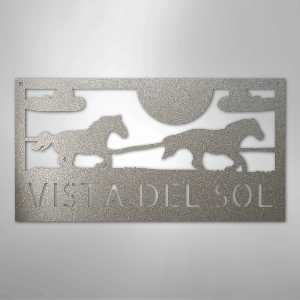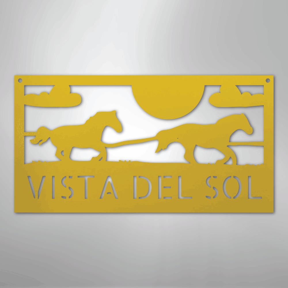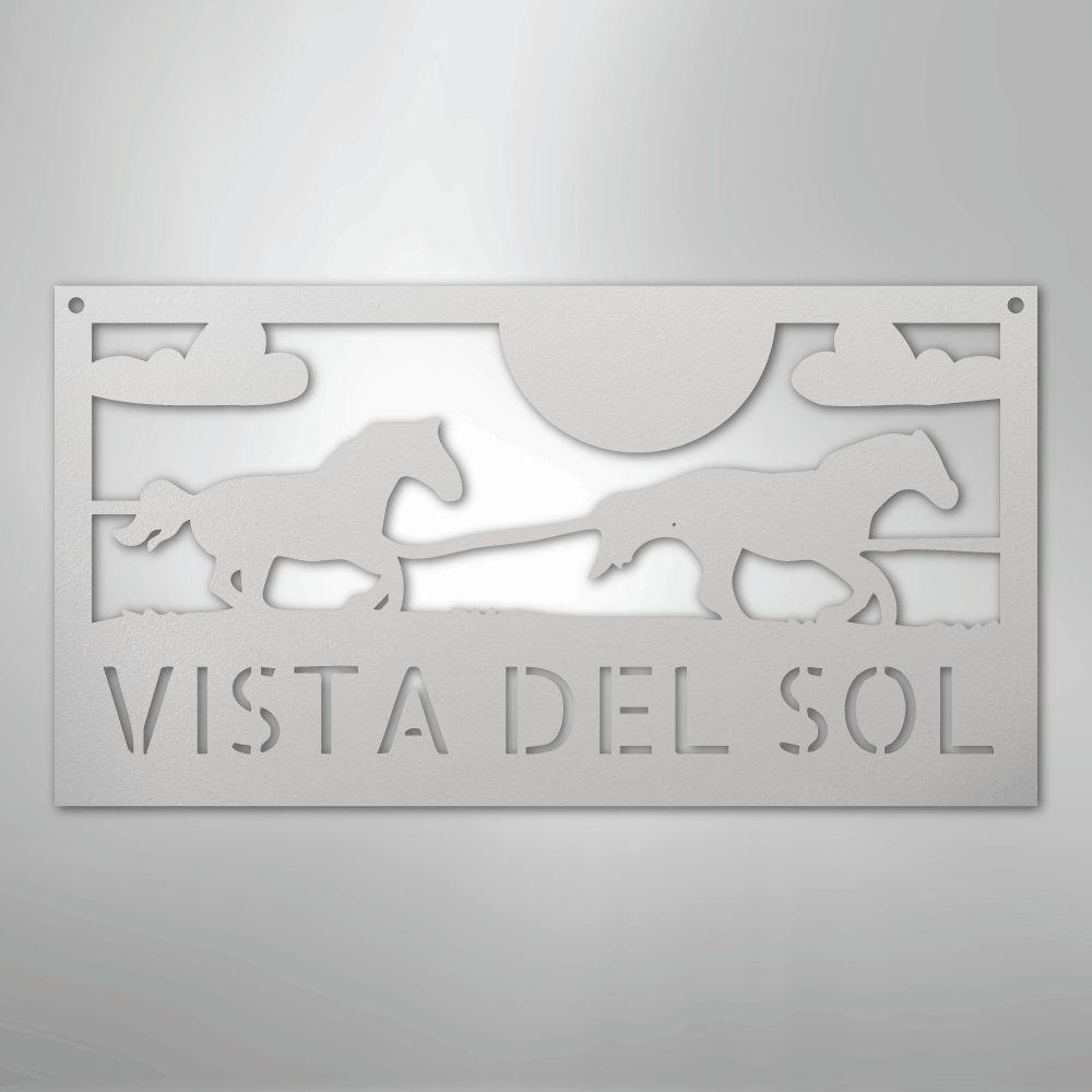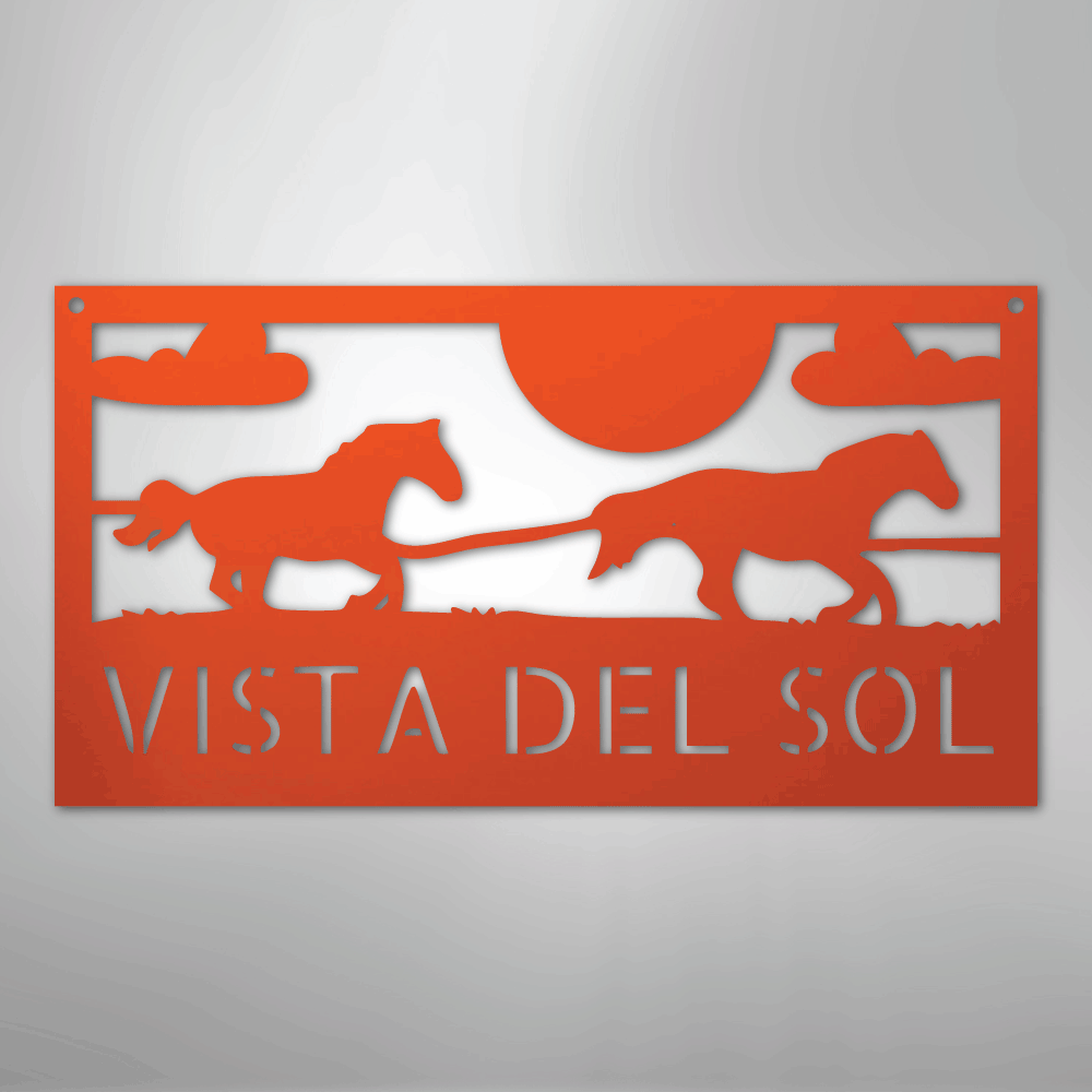Detailed cuts are highlighted in this gorgeous sign that will display amazingly in your family room, barn, stable -- anywhere a horse-y reminder fits the bill! This lovely custom laser-cut sign features a pair of running horses with windswept manes and tales -- plus clouds and sun! Nice area for your personalization at the bottom of this rectangular plaque!